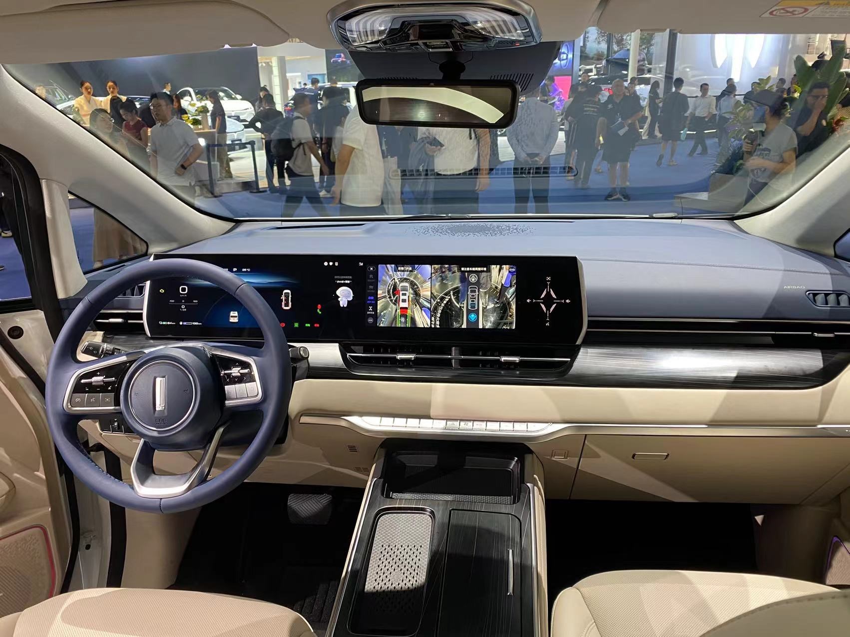 進(jìn)入車內(nèi),最引人矚目的便是由三塊12.3英寸屏組成的聯(lián)屏系統(tǒng),并內(nèi)置高通驍龍8155芯片斑馬智行系統(tǒng)。主副駕車門上還配備了電子后視鏡(選裝件)的車內(nèi)顯示屏,座艙的科技感濃重。整個(gè)內(nèi)飾風(fēng)格素雅簡(jiǎn)約,中控臺(tái)和中央通道區(qū)域使用了大面積皮質(zhì)包覆,質(zhì)感豪華。